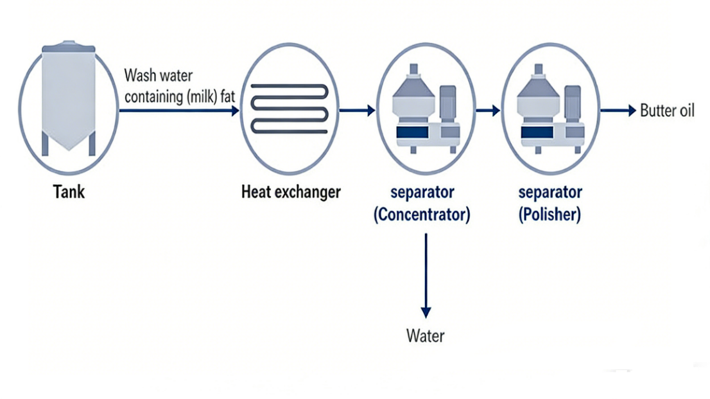 The Process Flow: The wash water containing milk fat is heated and sent to a 2-stage separation system.