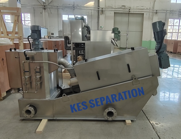 KESS screw press sludge dewatering machine is a kind of economic and environmentally friendly sludge dewatering equipment. It is a new type of sludge extrusion dewatering equipment by using the principle of screw extrusion, through the strong squeezing force generated by the change of screw diameter and screw pitch, and the tiny gap between the floating ring and the fixed ring, to realize solid-liquid separation.