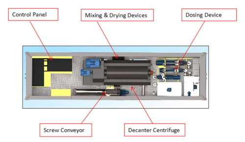 The Containerized Centrifuge Separation unit is composed of feeding pumps, chemical enhancement unit, high speed decanter centrifuge, solids transfer conveyor and mixing & drying unit. All the parts are put in one 20ft container and controlled by PLC control system and can work automatically by pre-set. Then containerized centrifuge separation unit is easy for movement and fast installation. It can be used for oily sludge treatment, waste water treatment, dredging sludge treatment, etc.